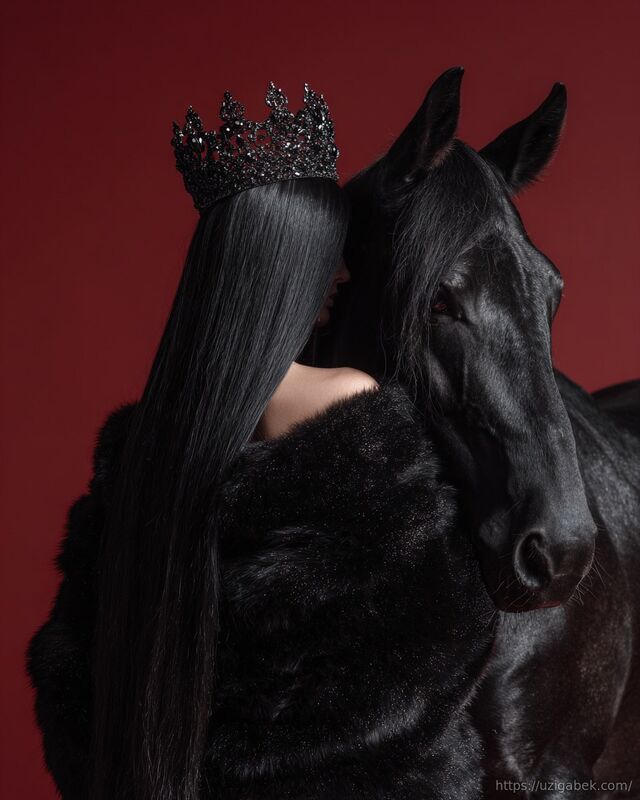 Qora ot va qora libosdagi malika obrazi