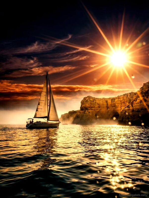 Quyosh botishi dengizda yelkanli kema juda go'zal manzara kash etgan