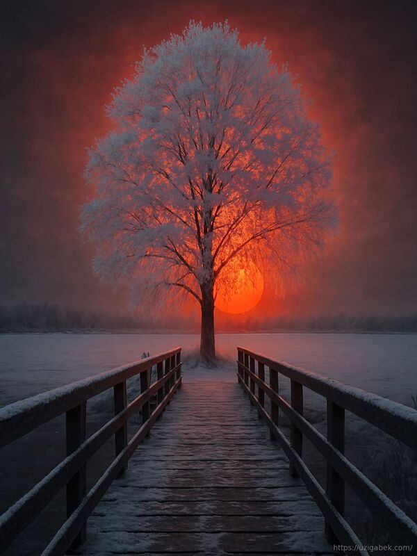 Bosh sahifa » Foto albom » Quyosh botishi manzaralari » Qor bilan qoplangan draht ortiga botayotgan quyosh